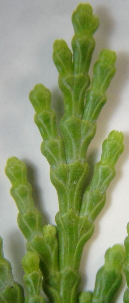 Escamosas, con las bases largamente envolventes sobre la ramita, triangulares en la parte apical, de color verde oscuro brillante y algunas matizadas de amarillo.