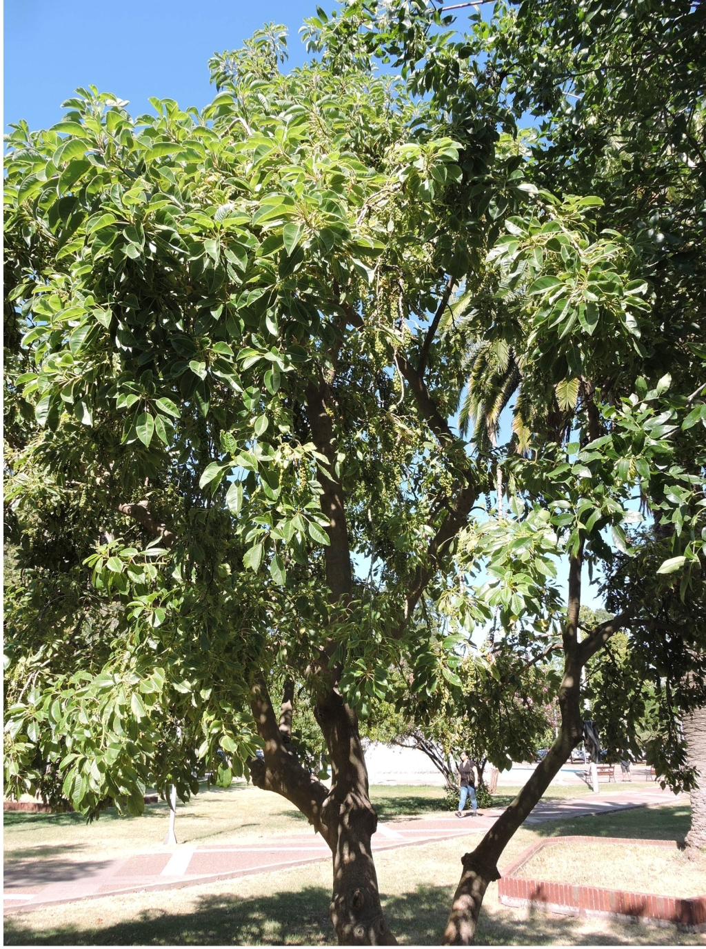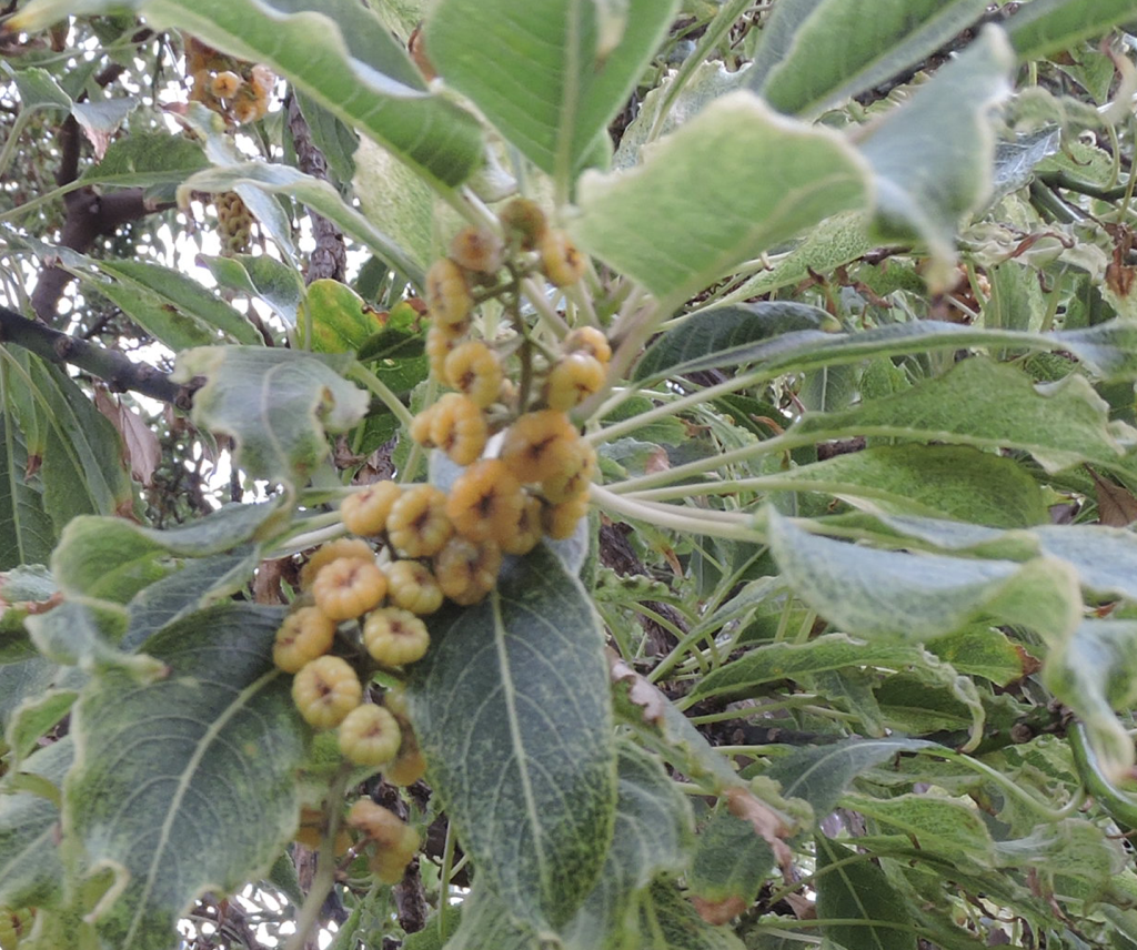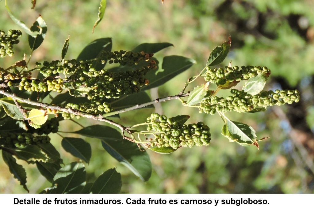Especie dioica, es decir, hay ejemplares con flores femeninas y ejemplares con flores masculinas. Árbol de gran porte pudiendo alcanzar 15 m de altura y hasta 3m de diámetro en la base. Copa globosa, amplia de 10-12m. Raíces tabulares que emergen al exterior.