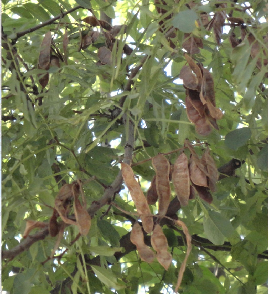 Legumbre lateralmente comprimida, péndula, castaño oscuro.