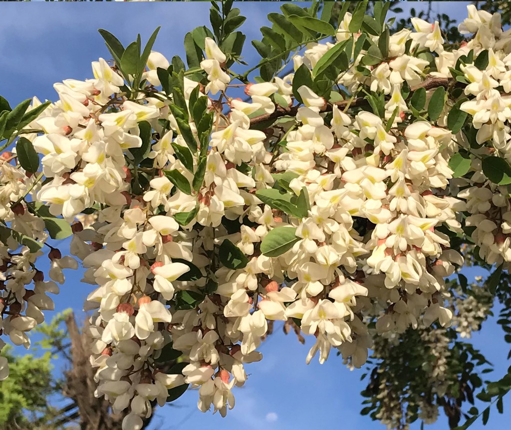 Hermafroditas, blancas a rosado pálido, perfumadas, nectaríferas, reunidas en inflorescencias colgantes.